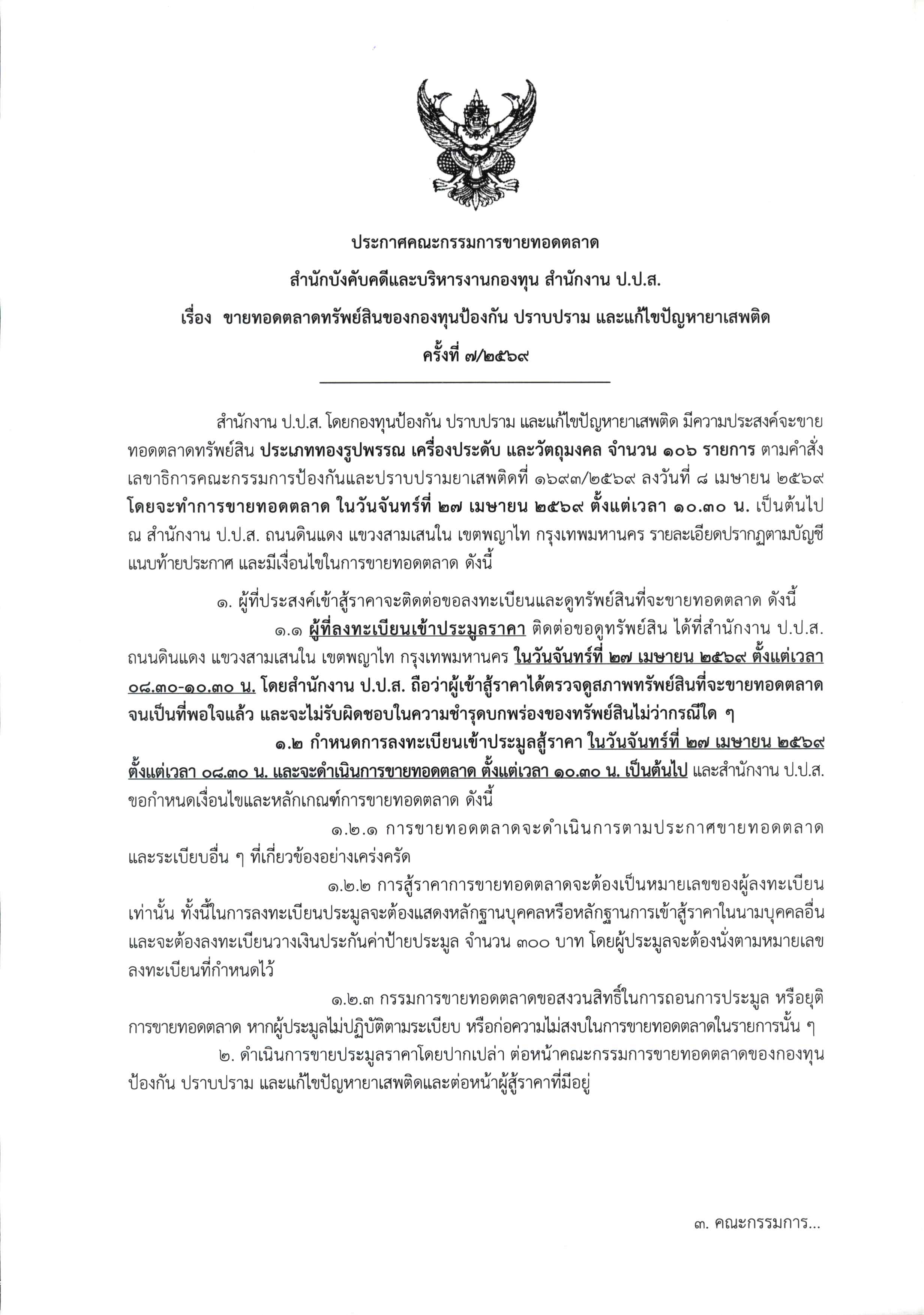 ประกาศคณะกรรมการขายทอดตลาด สำนักบังคับคดีและบริหารงานกองทุน สำนักงาน ป.ป.ส. เรื่อง ขายทอดตลาดทรัพย์สินของกองทุนป้องกัน ปราบปราม และแก้ไขปัญหายาเสพติด ครั้งที่ 7/2569 ประเภททองรูปพรรณ เครื่องประดับ วัตถุมงคล ในวันจันทร์ที่ 27 เมษายน 2569 จำนวน 106 รายการ