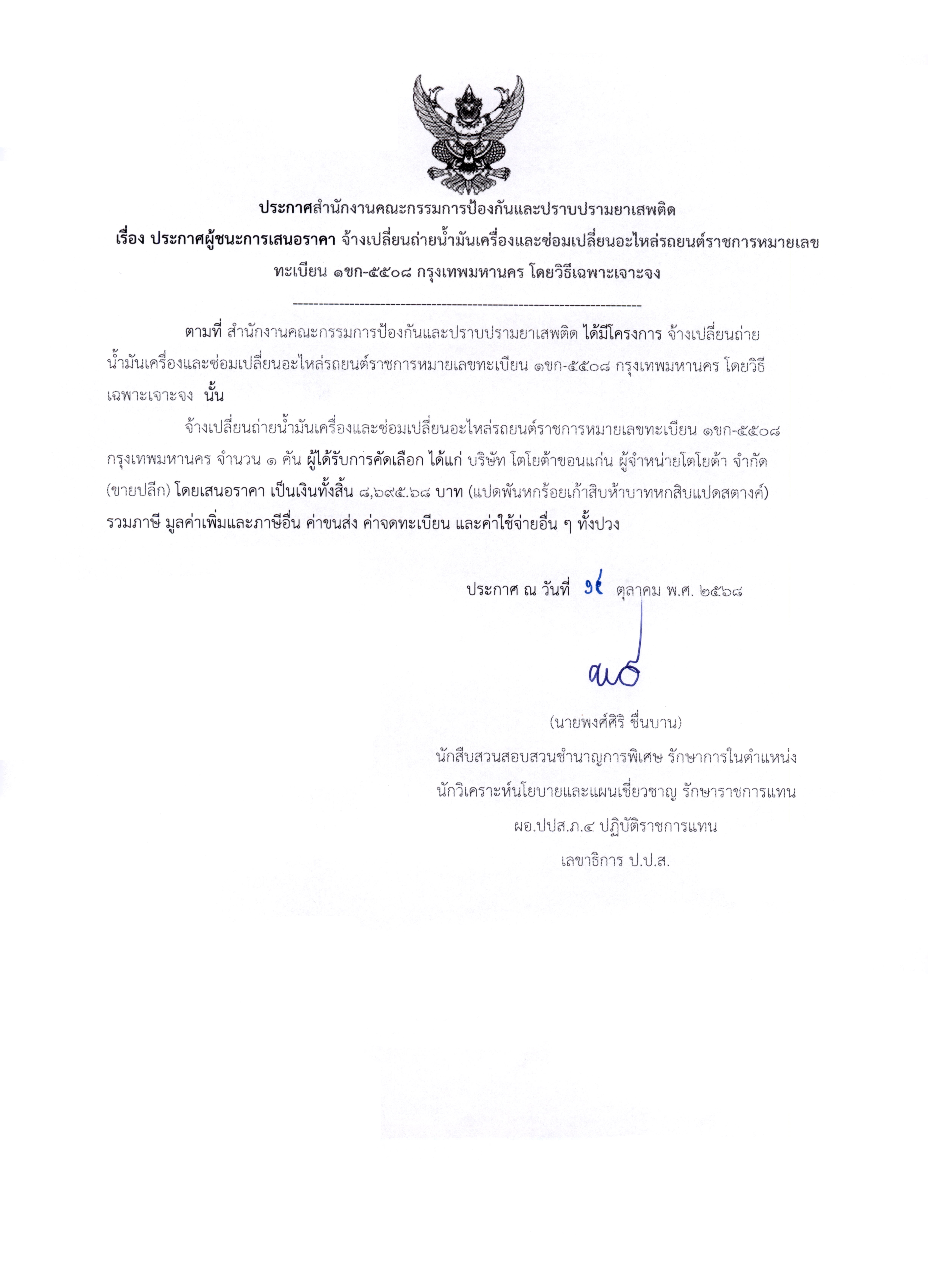 ปปส.ภ.๔ ประกาศผู้ชนะการเสนอราคา จ้างเปลี่ยนถ่ายน้ำมันเครื่องและซ่อมเปลี่ยนอะไหล่รถยนต์ราชการหมายเลขทะเบียน๑ขก-๕๕๐๘ กรุงเทพมหานคร โดยวิธีเฉพาะเจาะจง