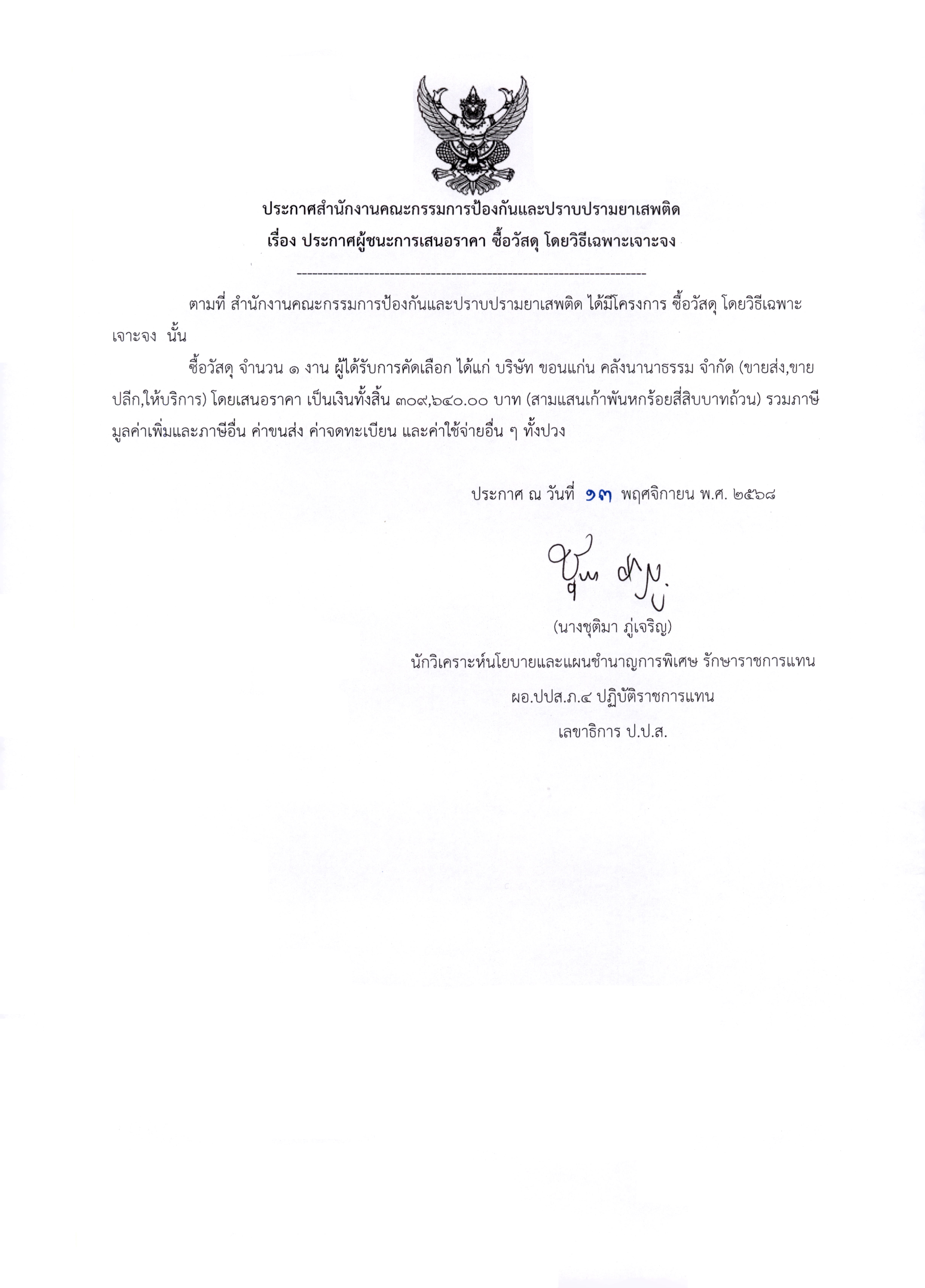 ปปส.ภ.๔ ประกาศผู้ชนะการเสนอราคา ซื้อวัสดุ โดยวิธีเฉพาะเจาะจง