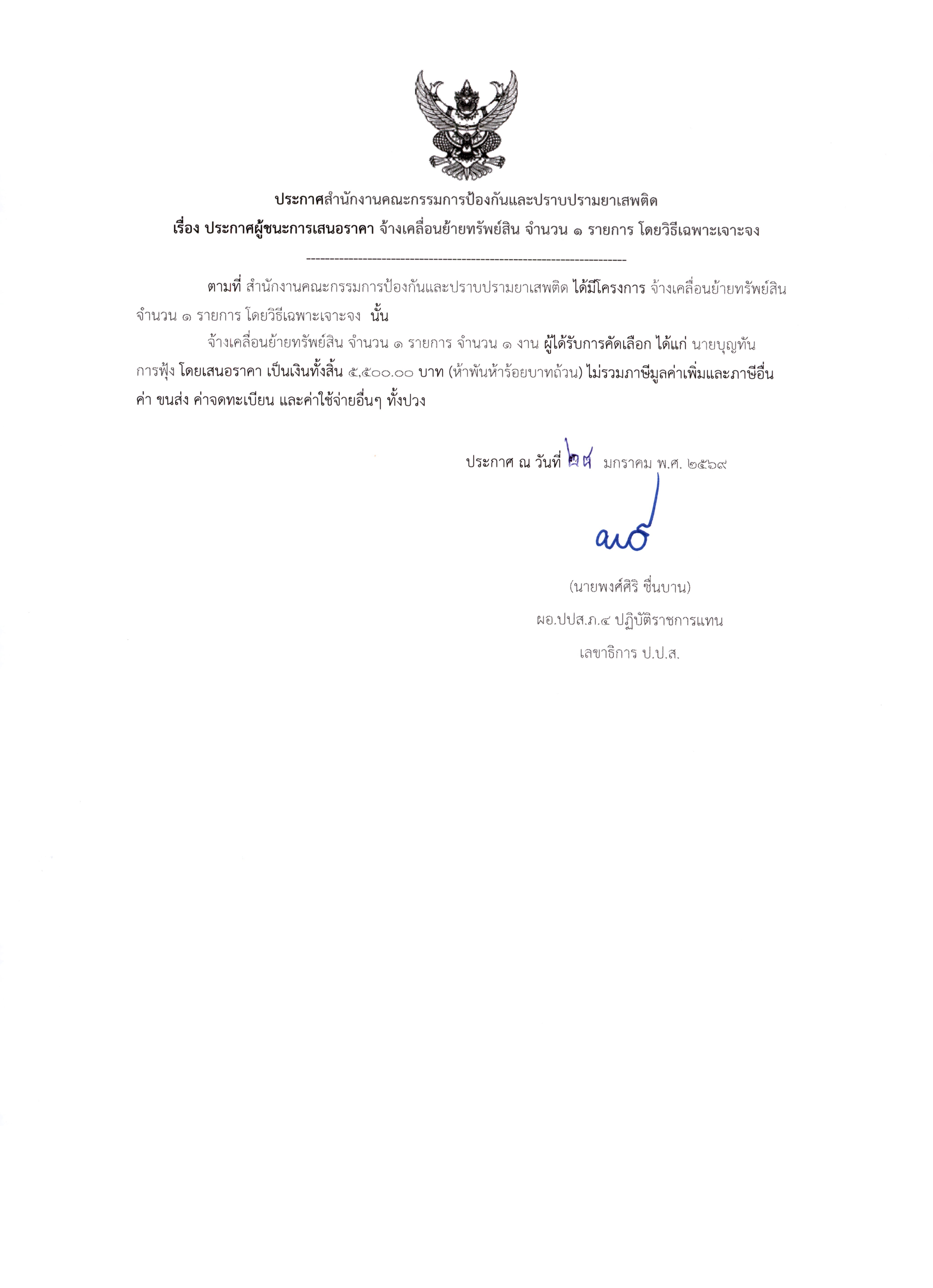 ปปส.ภ.๔ ประกาศผู้ชนะการเสนอราคา จ้างเคลื่อนย้ายทรัพย์สิน จำนวน ๑ รายการ โดยวิธีเฉพาะเจาะจง